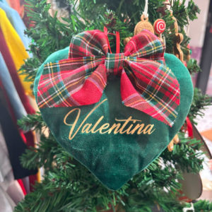 Un cuore in velluto che racconta affetto, ricordi e Natale. Personalizzato con il nome in elegante oro e impreziosito da un caldo fiocco scozzese, diventa un piccolo simbolo d’amore da appendere all’albero. Un pensiero che scalda, un dettaglio che resta.